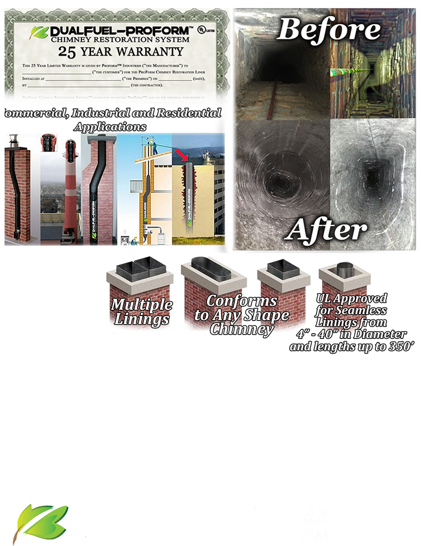 ProForm Chimney RestorationTM is a non-destructive chimney lining system which conforms to any shape, size or length chimney. ProForm Chimney RestorationTM is a corrosion-proof, flame and heat resistant, airtight liner tube made of a composite material with the rigidity of steel, without seams and a fraction of the weight.