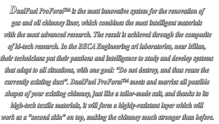 ProForm Chimney RestorationTM is a non-destructive chimney lining system which conforms to any shape, size or length chimney. ProForm Chimney RestorationTM is a corrosion-proof, flame and heat resistant, airtight liner tube made of a composite material with the rigidity of steel, without seams and a fraction of the weight.